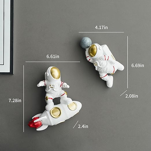 Size: The 3pcs unique astronaut wall decorations measure 4.13 x 2.75 x 5.7 inches, 4.13 x 2.55 x 5.51 inches, these outer space man wall decorations are perfect decoration for any room.