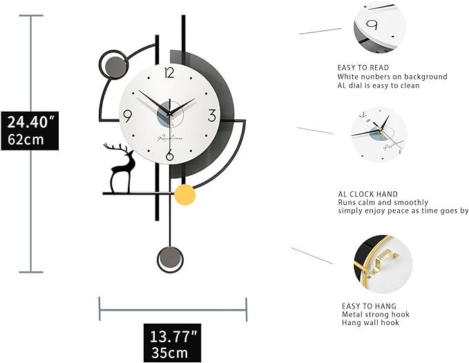 Large Wall Clocks for Living Room Decor Modern Pendulum Wall Clock Silent Quartz Battery Operated Non-Ticking for Bedroom Kitchen Office 24inch Black Metal Deer Clock Wall Decor for Home Indoor