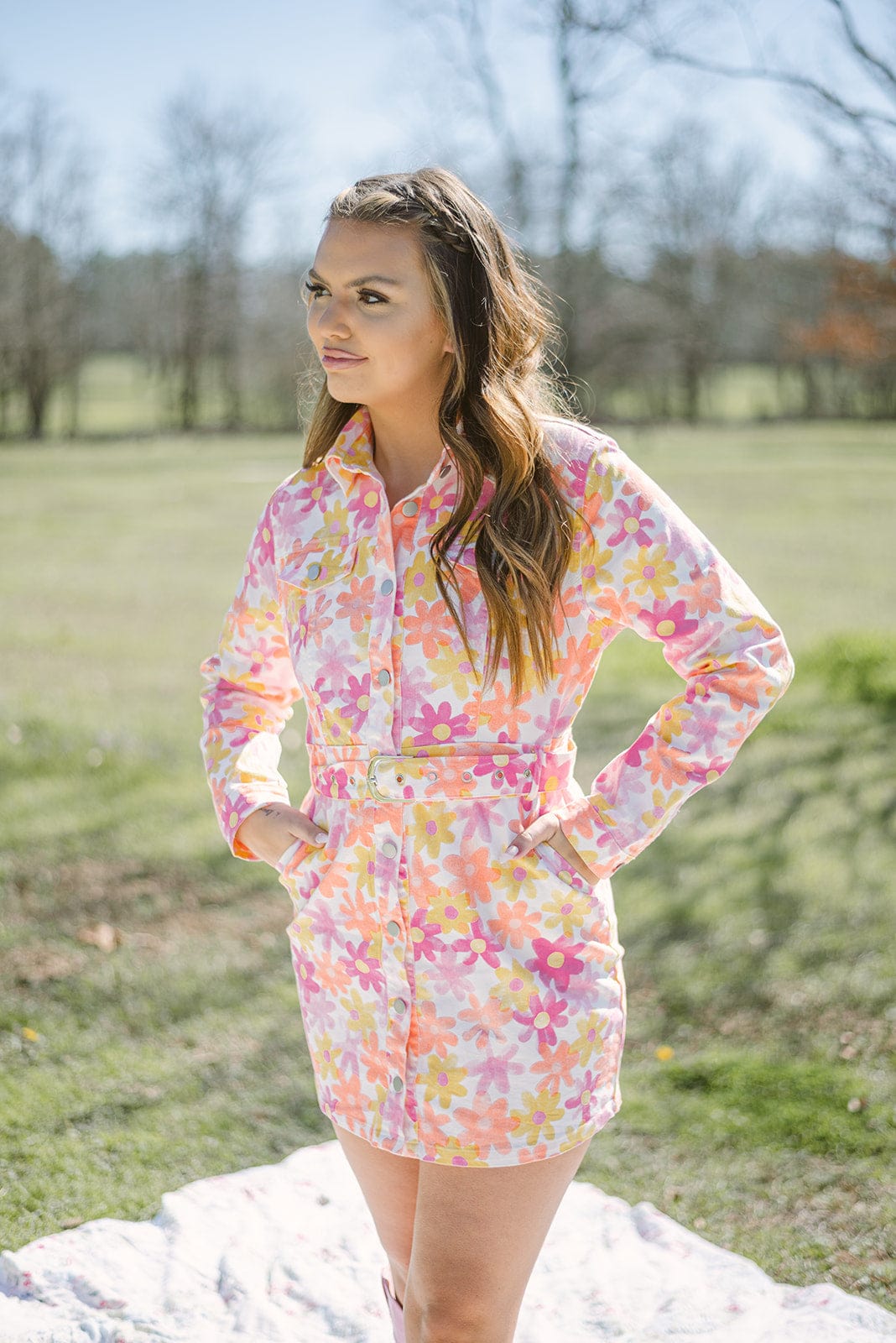 Transform any outfit into a bold and feminine statement with our Pink & Orange Flower Belted Denim Dress! This mini dress features a stunning flower print. a flattering belted waist. and stretchy lightweight denim material for a comfortable and fitted look. With a stylish collar and button up design. this dress is perfect for any occasion. Elevate your wardrobe with this must-have piece!